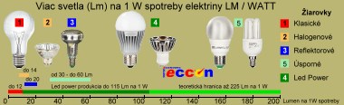 Pre porovnanie intenzity svetla žiaroviek je potrebné poznať ich základné faktory (obr. hore). Klasická 40-wattová žiarovka má intenzitu svetla cca. 480